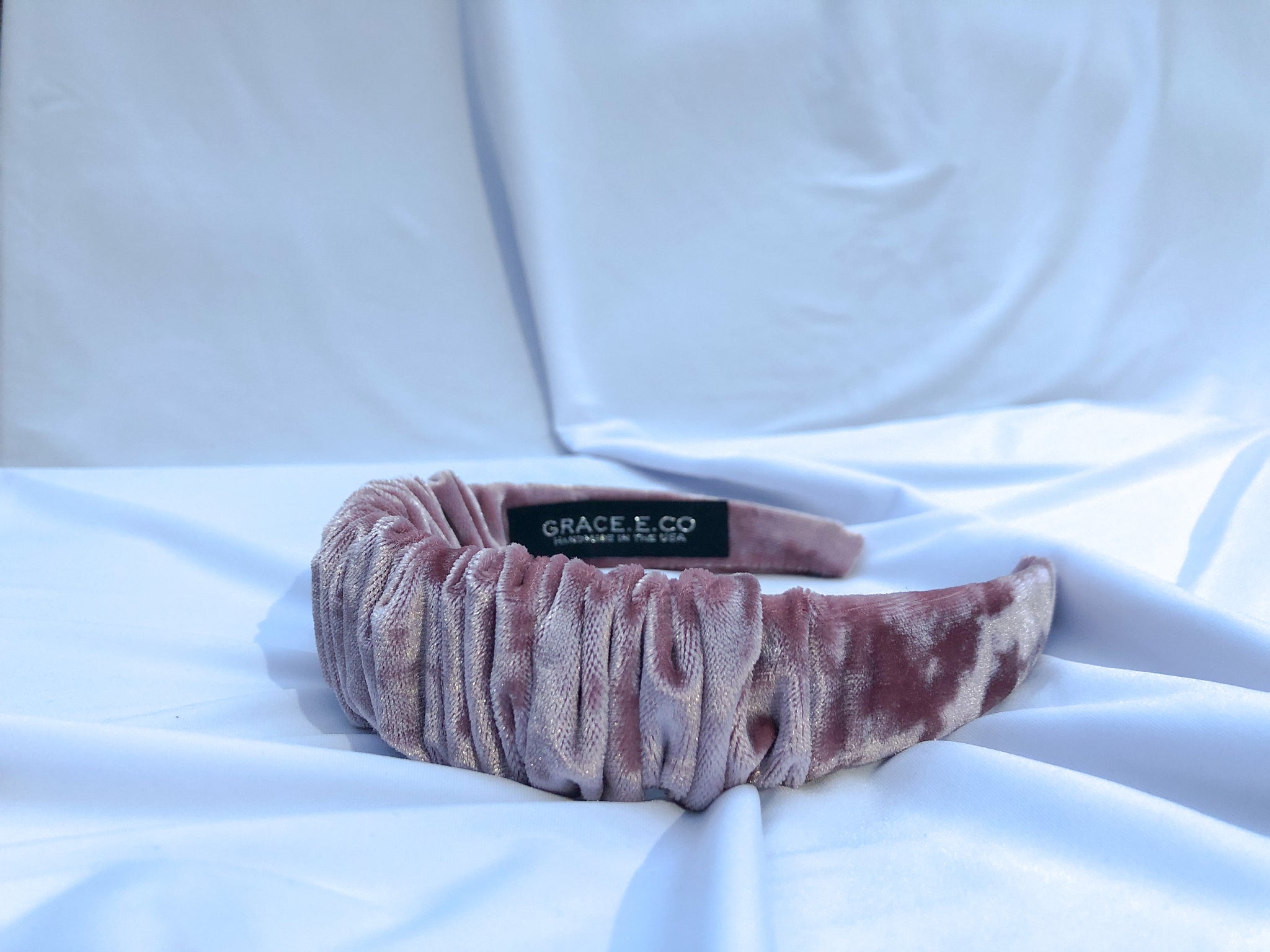 Women’s or girl’s velvet headbands in a beautiful blush pink color: “Dusty Pink”. Available in Top Knot and Scrunchie styles.