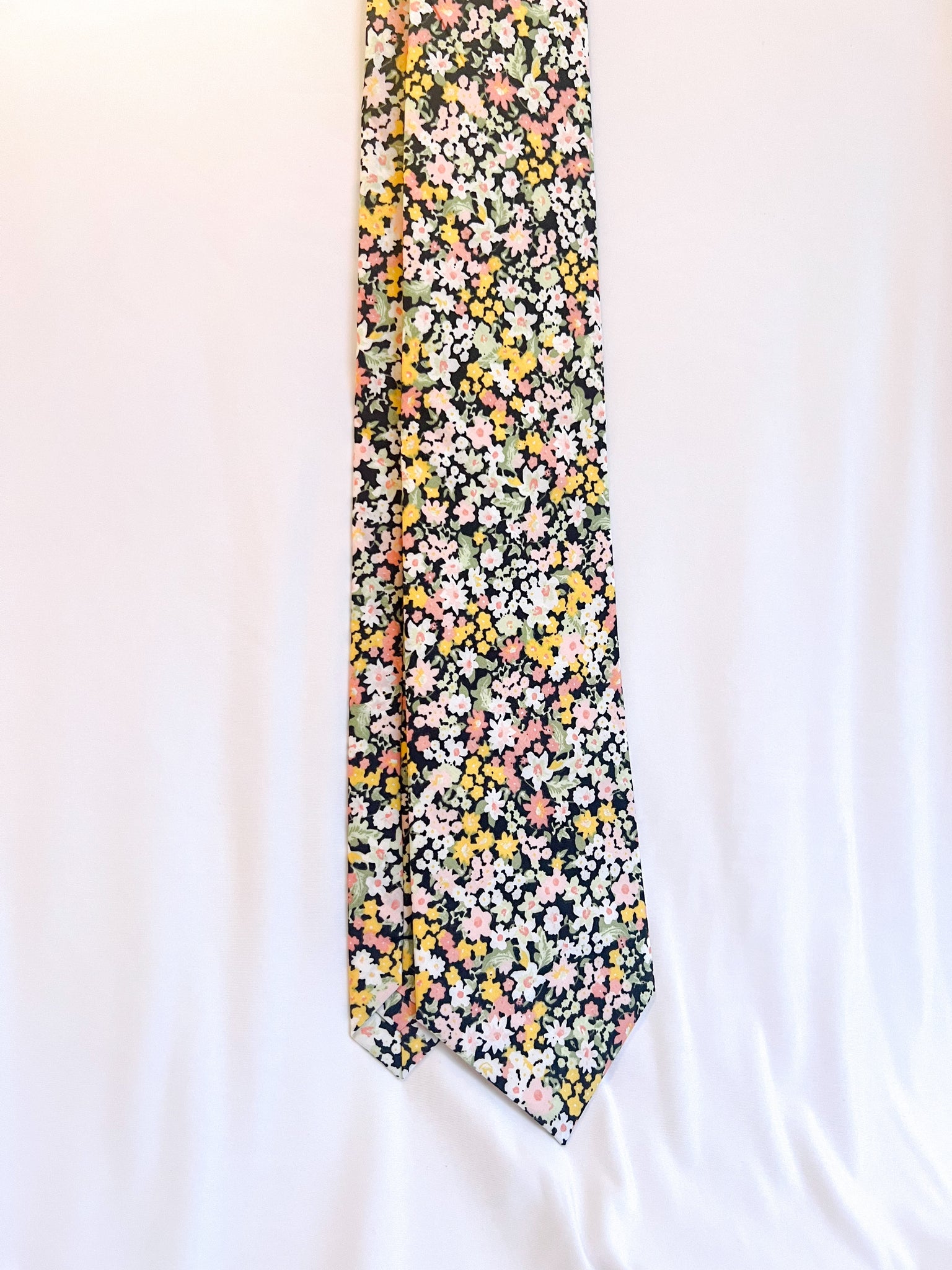 Crafted from the softest cotton, this exquisite limited necktie offers a truly one-of-a-kind look. Delicate pink and yellow floral details are set atop a sophisticated black background, enriched with subtle cream and green accents. With only three available, this timeless classic is sure to lend an air of refined elegance to any ensemble.