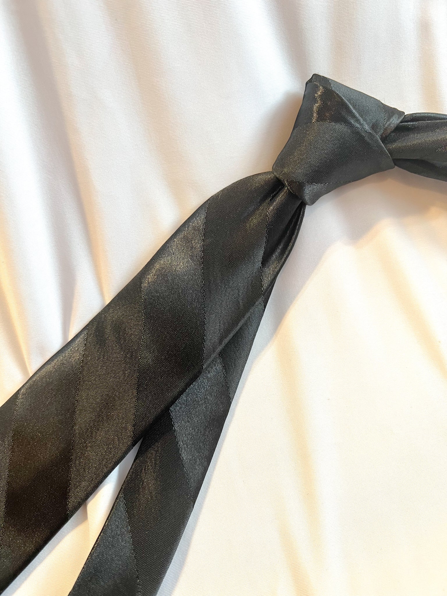 Achieve a timeless look with this custom-made, Men's Satin Stripe Necktie. Whether it's a special occasion or just the everyday, this luxurious piece, crafted from high-quality satin and enhanced by a classic black striped pattern, will add an air of sophistication and refinement to any wardrobe.