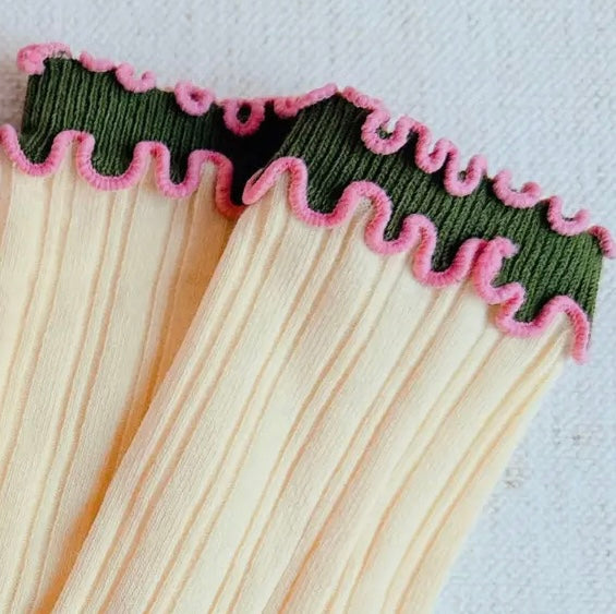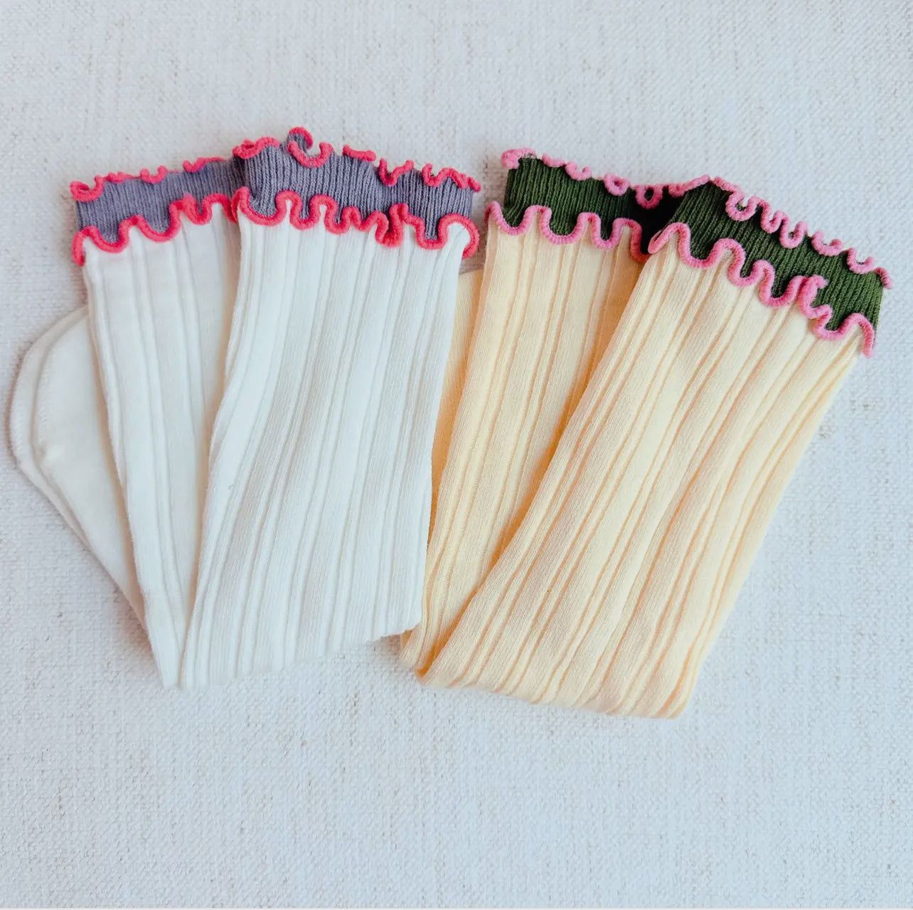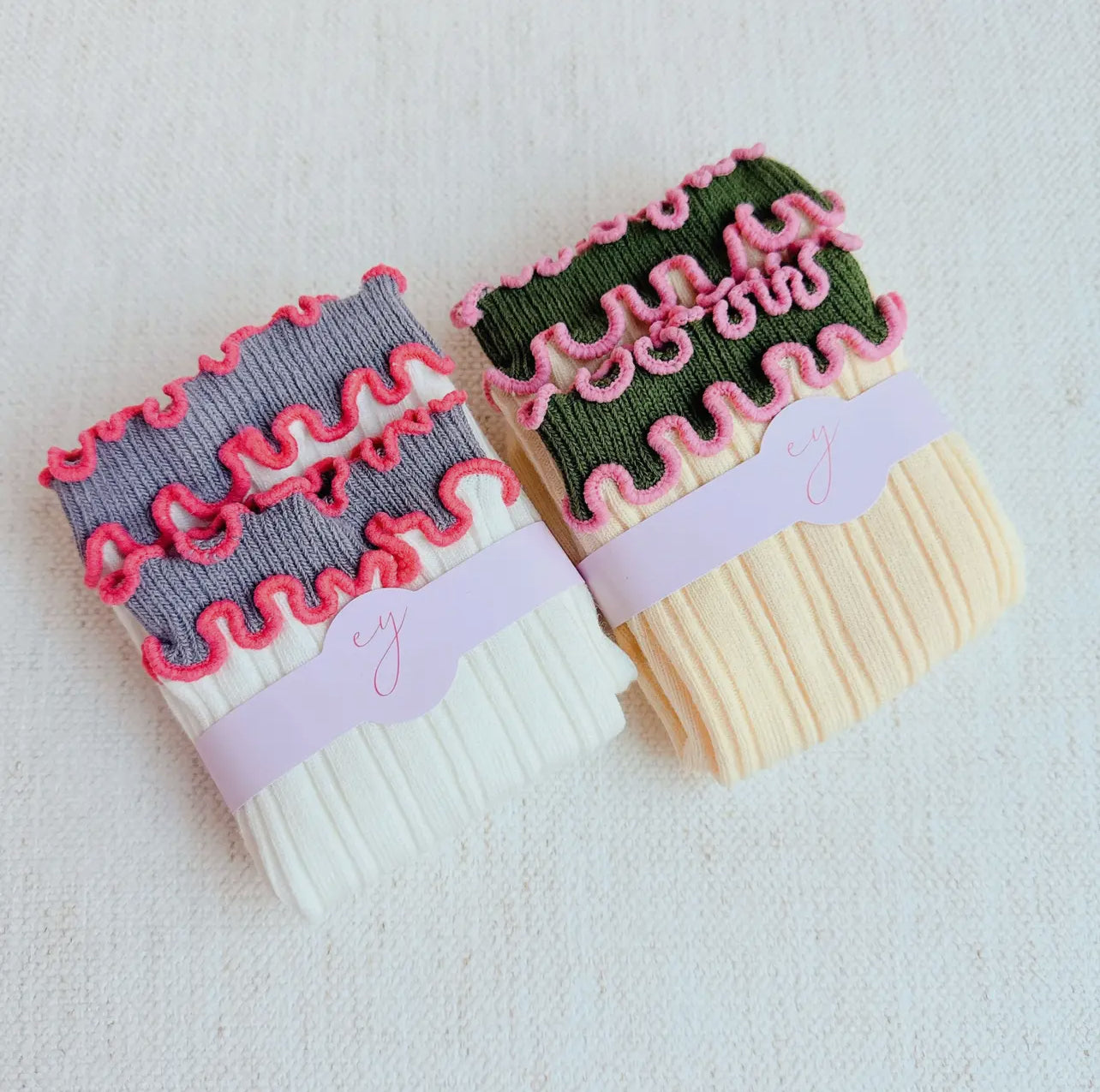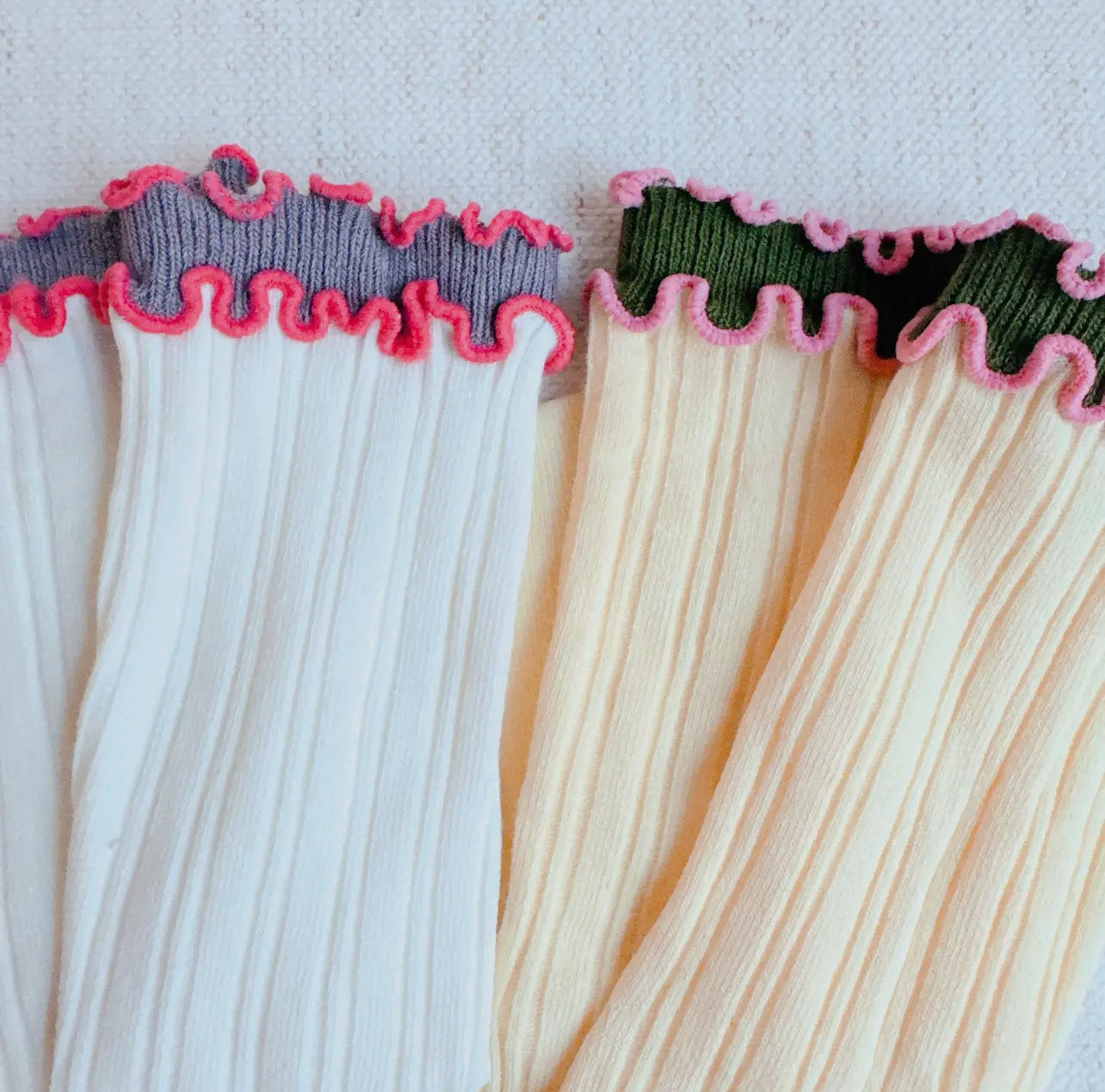 Enhance your sock game with our Ribbed Ruffle socks. Featuring unique designs with rippled ruffle accents in pretty color combinations, these socks are both stylish and comfortable. Made with super soft materials, they are the perfect little add on to elevate any outfit.